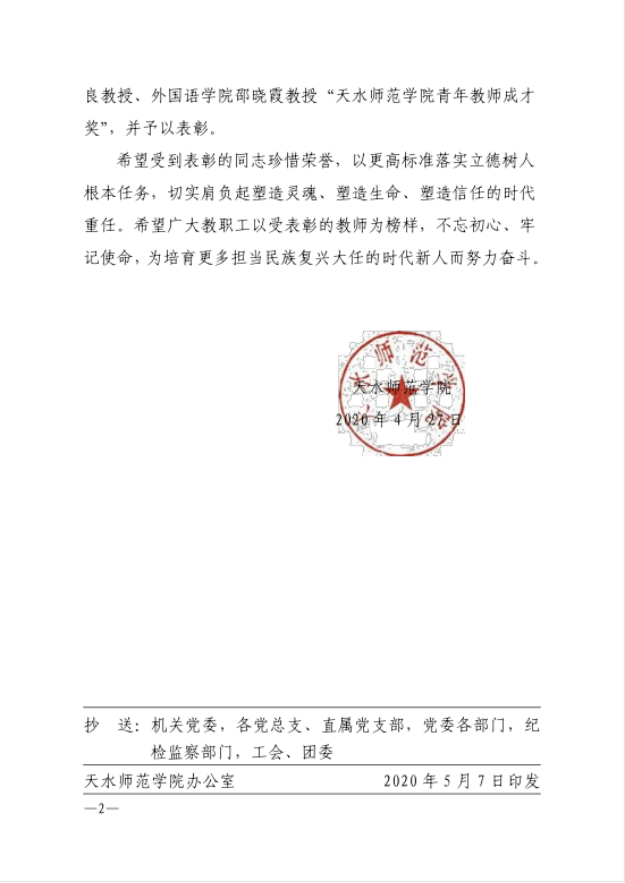 热烈祝贺我院吴彦文教授、杨学良教授荣获“天水师范学院教学名师”、“天水师范学院青年教师成才奖”荣誉称号。