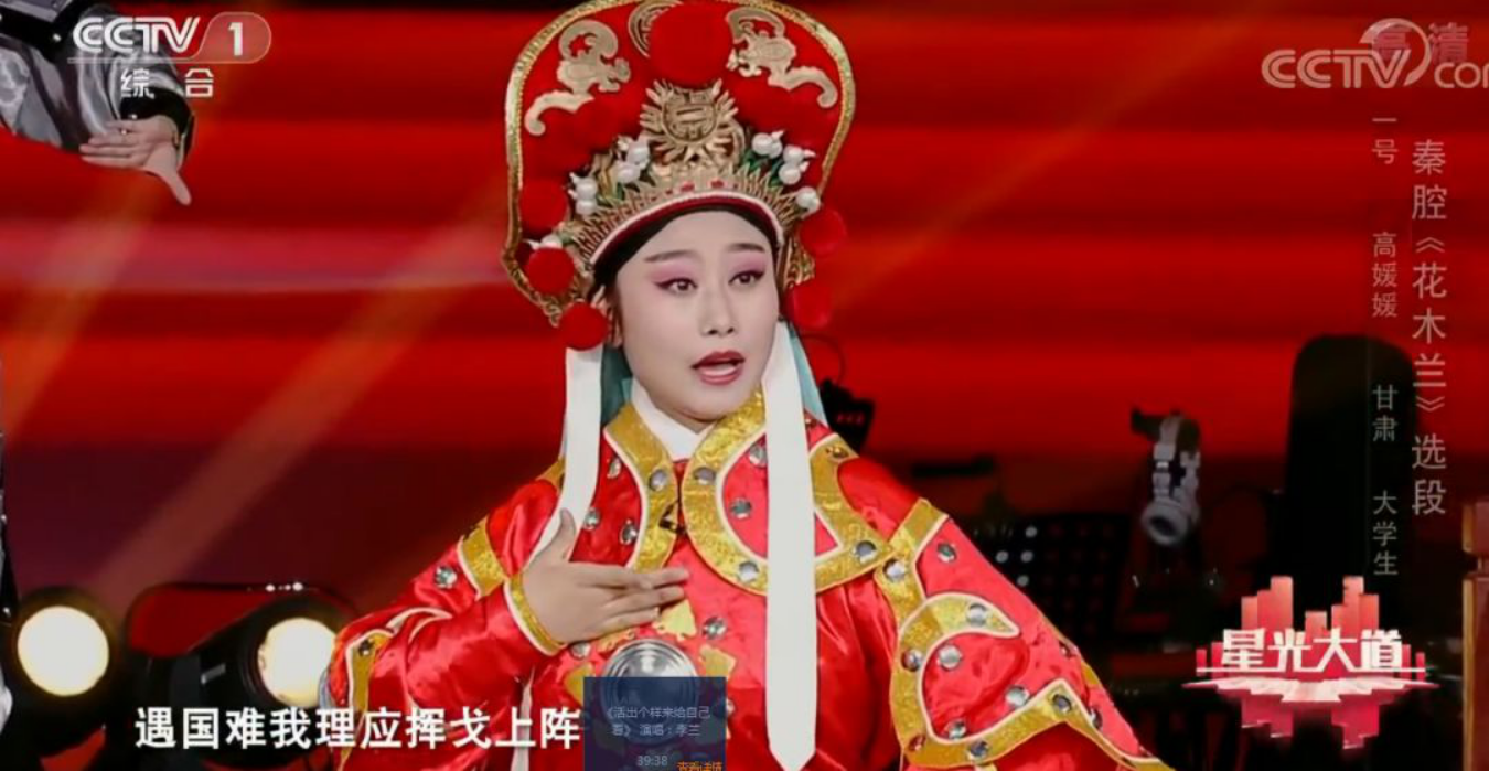 在《星光大道》的节目里,高媛媛先以秦腔《花木兰》选段惊艳亮相,俊俏的扮相,完美地呈现出花木兰英姿飒爽的形象。再接下来的第二关中,她又化身端庄大气的杨贵妃,婉转的唱腔、优雅的身段将京剧《梨花颂》表现得淋漓尽致,让人一饱眼福。最后,高媛媛以一首《玛依拉变奏曲》完美收官,那活泼可爱的形象、动听的花腔,赢得了现场观众的阵阵掌声。