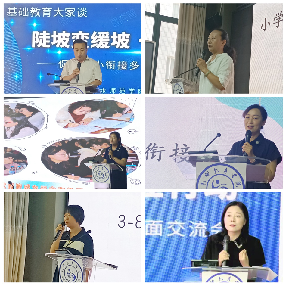 在嘉宾主旨报告活动中,教师教育学院杨元元老师代表小学教育系作题为《小学一年级新生学习适应性研究——以T市J小学为例》的主旨演讲;孟昱老师代表学前教育系作题为《3-8岁儿童阅读发展一体化研究》的主旨演讲;天水市幼儿园副园长金华作题为《顺应成长 自然衔接》的主旨报告;建设路第二小学副校长韩慈娟作题为《一年级,我来了!》的主旨报告;天水市实验小学教师肖黎黎作题为《幼小衔接家长之困惑》的主旨报告。5位嘉宾分别从校、校园、学者、校长、一线教师的角度对幼小衔接的问题发表了见解。