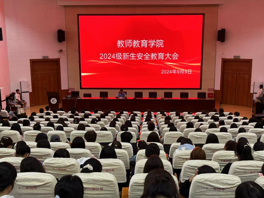 99日,教师教育学院在学校二号报告厅召开2024级新生安全教育大会,秦州公安分局天水郡派出所民警梁鑫宝对我院2024级新生进行了安全培训,全休辅导员参加培训。