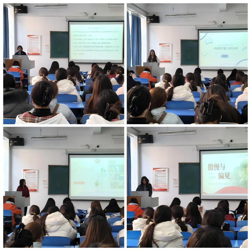 拜小红同学分享了简·奥斯汀的《傲慢与偏见》。她详细讲述了伊丽莎白与达西先生之间的爱情故事,并探讨了小说中对社会阶级与个人偏见的深刻批判;冯敏同学则带来了张嘉佳的《云边有个小卖部》,通过刘十三的故事,引发了大家对亲情与成长的思考。最后,石亚婷分享了哈珀·李的《杀死一只知更鸟》,深刻剖析了种族歧视对社会的影响,呼吁大家关注社会公正与平等。