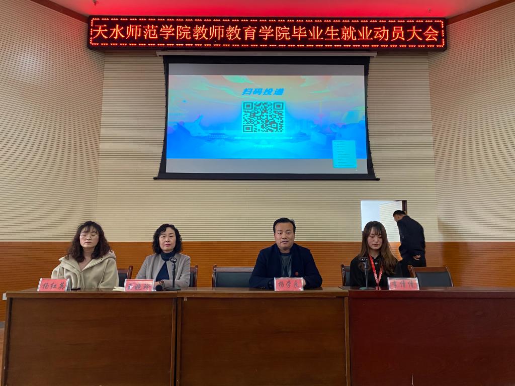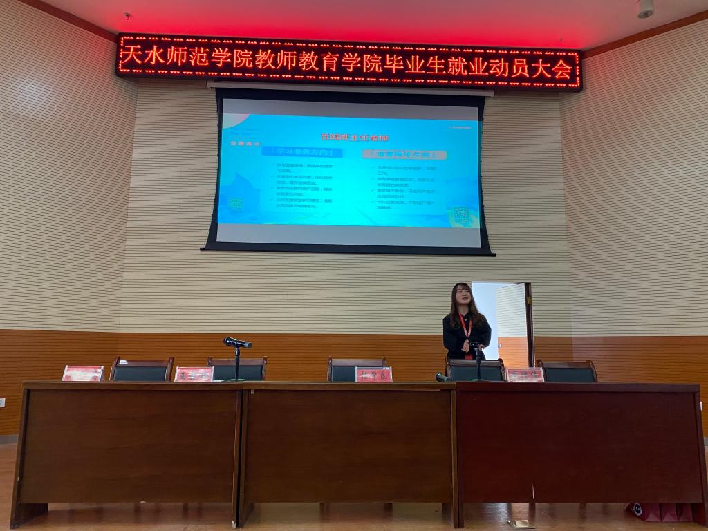 会议强调,2021届毕业生就业形势依然严峻,毕业生要有危机感和紧迫感,将就业工作摆在突出重要位置。同时,会议还就教师教育学院2020届毕业生的就业情况做了详细说明。针对这些问题,会议建议同学们应首先从自我水平、就业环境进行认知了解,结合自身实际,根据家庭、学习等情况合理定位自身,了解就业形势、关注就业信息,抓住时机,果断决策,实现“先就业,后择业”“早就业,就好业”。动员会上,李倩倩分享了自己的求职经历,并将学而思网校的公司背景、发展以及福利待遇做了详细的介绍;麻洲田安排播放了轮台县历史文化、教育现状的宣传片并做了解说;邓劲松详细介绍了轮台县各学校的硬件设施以及教师的福利待遇;吕新丽强调,轮台县教育设施齐全,主要存在缺人才的现象,表示期望同学们加入轮台县的教育事业