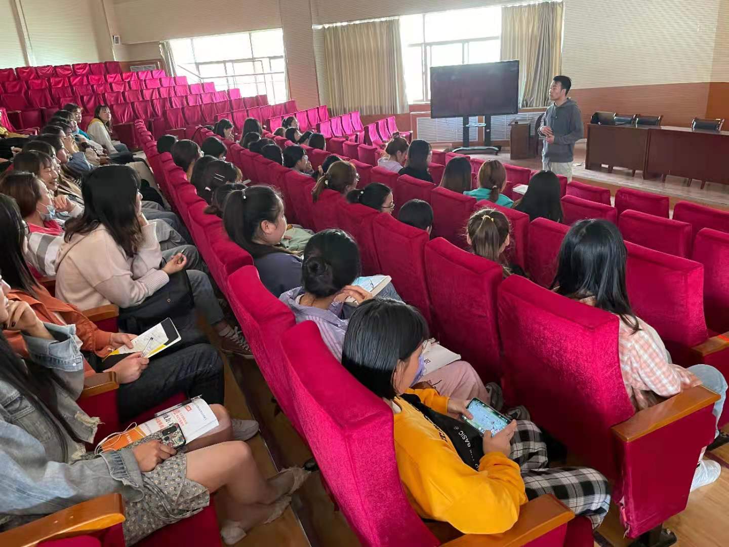 29日宣讲招聘会上杨院长给毕业生作了就业工作动员,他表示,“人的思想有多远,路就有多远”,鼓励毕业生大胆走出去就业,向省外发达城市迈进,学习新技术与新理念,在省外激烈的竞争环境中优化自己,转变就业观念。新疆拜城县教科局人事办师洋洋播放了新疆拜城县的历史文化视频短片,并详细介绍了拜城县幼儿园和小学的教育发展现状,以及福利待遇情况,并和同学们亲切的互动,一一解答了毕业生的问题,非常期望同学们加入拜城县的教育事业。宣讲会结束后,毕业生和师老师进行了进一步洽谈,有11毕业生与拜城县教科局达成协议并成功签约。