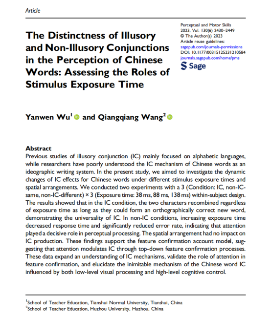 近日,学院吴彦文教授和湖州师范学院教师教育学院的王强强博士在国际心理学杂志Perceptual and Motor Skills(SSCI,中科院SCI期刊,4区)上合作发表了题为“The Distinctness of Illusory and Non-Illusory Conjunctions in the Perception of Chinese Words: Assessing the Roles of Stimulus Exposure Time”的论文,揭示了汉语词语识别中的错觉性结合现象。